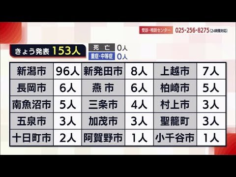 Share Facebook Twitter Pinterest LinkedIn 新潟県内では4日、新たに153人の新型コロナウイルス感染が確認されました。 県内では新潟市で96人、新発田市で8人など合わせて153人の新型コロナウイルス感染が発表されました。 死亡した人や重症・中等症の人はいませんでした。 一日の新規感染者数は9日連続で前の週の同じ曜日を下回りました。 県内では減少傾向が続いていますが、県は引き続き適切なマスクの着用と基本的な感染症対策などを徹底するよう呼びかけています。 新型コロナウイルス新型コロナウイルス感染症新潟県