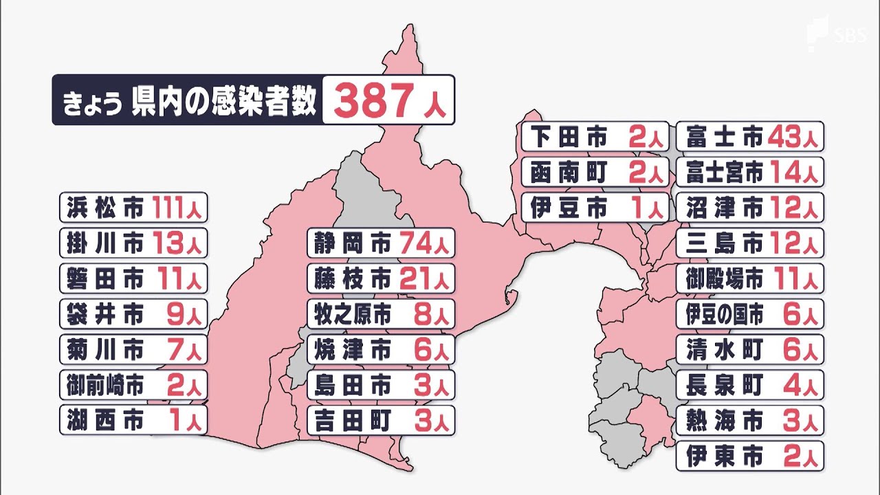 Share Facebook Twitter Pinterest LinkedIn 県内では6月5日、新たに387人が新型コロナウイルスに感染したことが分かりました。 1日あたりの新規感染者数は14日連続で前の週を同じ曜日を下回っています。 387人の感染者を自治体別にみますと▼浜松市で111人、▼静岡市で74人、▼富士市で43人、▼藤枝市で21人などとなっています。 6月5日、県内で死亡した人や新たなクラスターは確認されていません。 1日あたりの新規感染者は5月29日より160人ほど少なく、14日連続で前の週を下回りました。 JNNLocalNEWSSBSSBSテレビTBS系列TVUCOLVB0iYK8ahQ0mFn-lF-8gコロナ感染者今日ニュースローカルローカルニュース静岡静岡放送静岡新聞静岡新聞ニュース静岡県