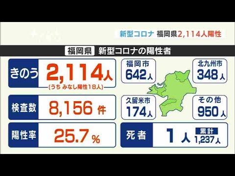 Share Facebook Twitter Pinterest LinkedIn 福岡県は14日、新型コロナウイルスの検査で新たに2114人の陽性を発表しました。 発表自治体ごとの内訳は、福岡市が642人、北九州市が348人、久留米市が174人、そのほかの地域が950人です。また、70代の男性が亡くなっています。 13日時点で、専用病床の使用率は前の日と同じ20.7%で、重症病床の使用率は2.8%でした。 佐賀県の新規陽性者は308人でした。亡くなった方はいません。 新型ウイルス検査で陽性