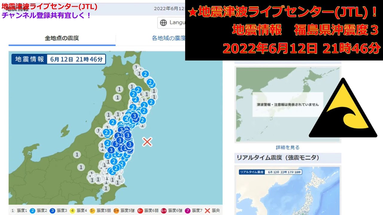 福島県沖地震ライブ震度3。地震発生の瞬間!2022/06/12。津波なし 緊急地震速報 瞬間 生放送 地震速報情報 JAPAN earthquake LIVE! 2022年6月12日 21時46分ごろ #地震 #福島県沖 #地震津波ライブセンター #緊急地震速報 #地震速報 #震度3 #地震ライブ #瞬間 #飲み込まれる #ライブ #宮城県 #Earthquake #Live 地震,津波,緊急地震速報,地震情報,地震速報 音,地震発生の瞬間,地震情報,地震の音,地震 瞬間,地震ライブ,NHK,生放送,TUNAMI,earthquake,LIVE,JAPAN,津波 飲み込まれる,津波警報,津波の恐ろしさ,津波 実験,津波 船,津波 逃げる,津波に飲み込まれる,津波 引き潮,津波 人,津波警報 音,津波 瞬間,津波 映画,津波 逃げる,