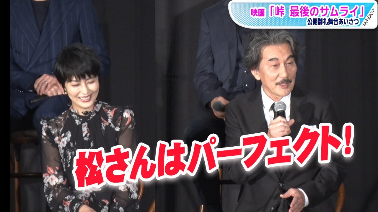 司馬遼太郎の幕末小説が原作で、役所広司さんが主演を務める映画「峠 最後のサムライ」(小泉堯史監督)の公開御礼舞台あいさつが6月18日、東京都内で行われ、役所さんや共演の松たか子さん、香川京子さん、田中泯さん、榎木孝明さん、AKIRAさんが登場した。