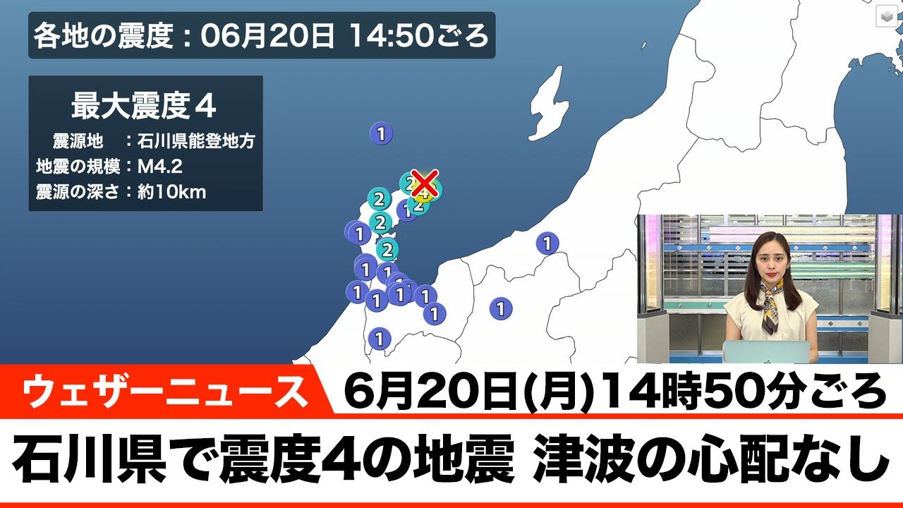 6月20日 14時50分頃石川県で最大震度4を観測する地震がありました。 この地震による津波の心配はありません。 ▼No.1お天気アプリ「ウェザーニュース」 https://weathernews.jp/s/download/weathernewstouch.html?fm=youtube 世界最大級の気象専門会社が運営するお天気アプリ「ウェザーニュース」 AI技術や日本最大の観測ネットワーク、全国のユーザーからの天気報告を活用し、予報精度No.1を獲得しました。 2021アナウンサーウェザーニュースニュース予報台風地震天気気象気象予報士津波減災防災
