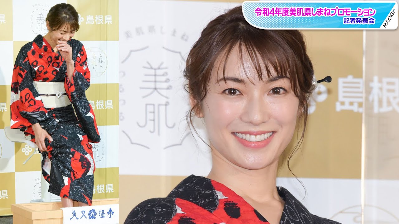 女優の内山理名さんがこのほど、東京都内で行われた島根県をPRする「令和4年度美肌県しまねプロモーション」の記者発表会に出席した。赤と黒を使った着物に白い帯を締めた大人可愛い浴衣姿で登場。後れ毛を残したラフなまとめ髪で“抜け感”をプラスしていた。