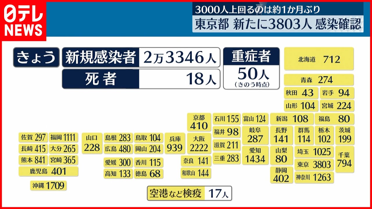 東京都内で新たに3803人の新型コロナウイルスへの感染が確認されました。3000人を上回るのはおよそ1か月ぶりです。
