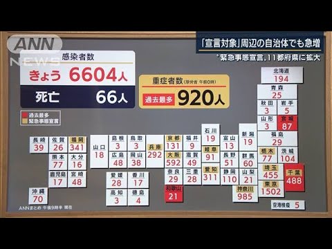 14日は全国で確認された新型コロナウイルス新規感染者は、午後9時半現在で6604人に上りました。重症者数は13日より20人増えて920人。11日連続で過去最多を更新しています。