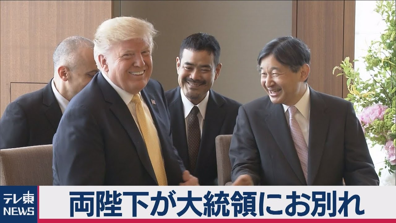 天皇、皇后両陛下は、即位後初の国賓として来日したアメリカのトランプ大統領夫妻にお別れの挨拶をするため、東京・千代田区のホテルを訪問されました。宮内庁によりますと、天皇陛下はご夫妻に「即位後の国賓として大統領夫妻をお迎えできて大変うれしく思います」と話し掛けられると、大統領は「私たちも両陛下のことをよく知ることができ、本当の友人同士になりました。両陛下はリーダーとして素晴らしいだけでなく、カップルとしても素晴らしいと感じ取ることができました」などと述べられました。懇談はおよそ20分間で、和やかな雰囲気で行なわれたということです。