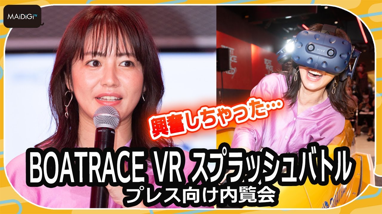 「BOATRACE VR スプラッシュバトル」は、一般財団法人BOATRACE振興会がボートレースの魅力や迫力を伝え、ファン、レーサーの育成を図ることを目的に開発。内覧会では、3人が実際に同アトラクションを体験、叫び声をあげながらレース対決し、磯山さんは「興奮した!」「最高!」と大興奮していた。