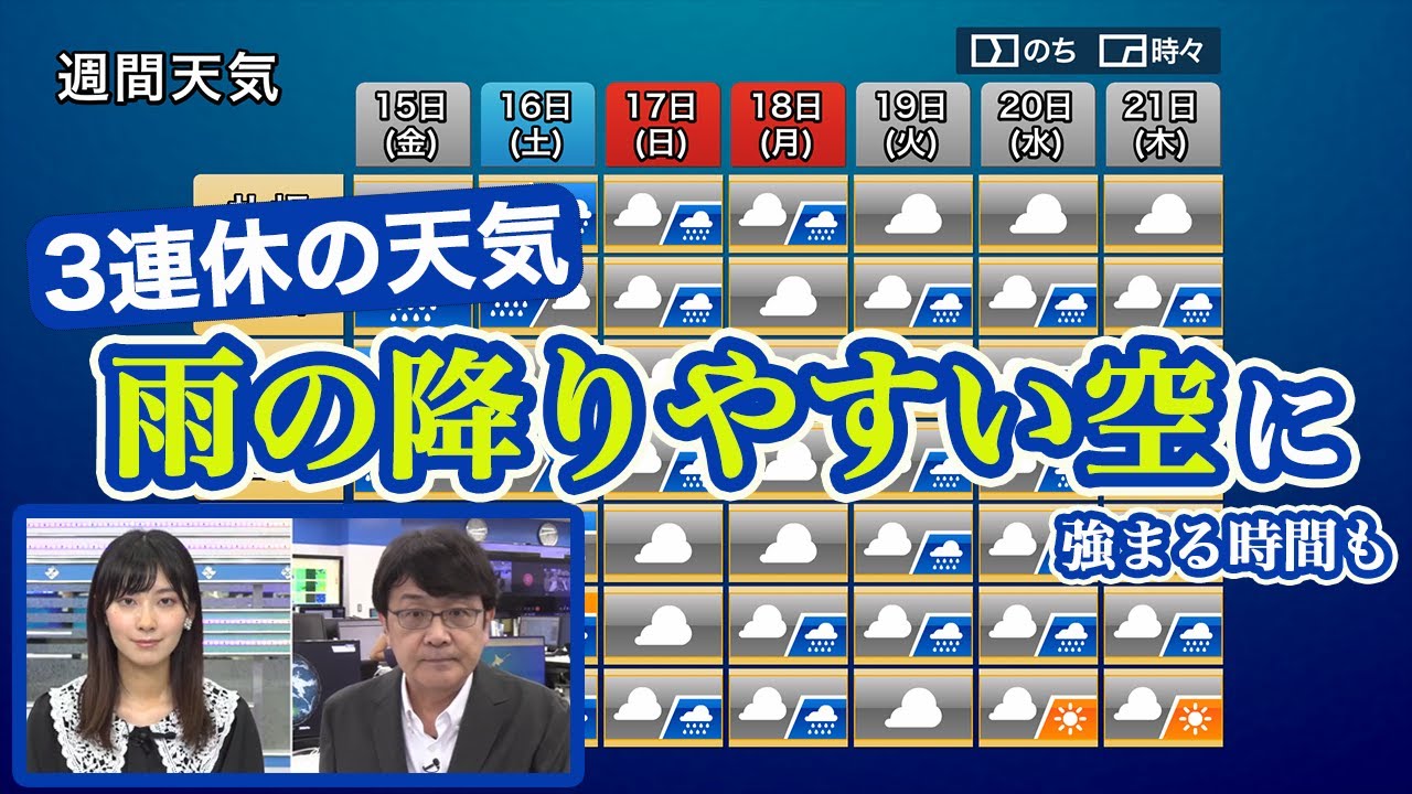 低気圧や前線が日本海を東へ進み、通過する影響で17日(日)にかけては広範囲で雨が降る見通しです。前線の位置や接近するタイミングにはまだ予報の幅がありますが、こまめに今後の最新情報を確認するようにしてください。