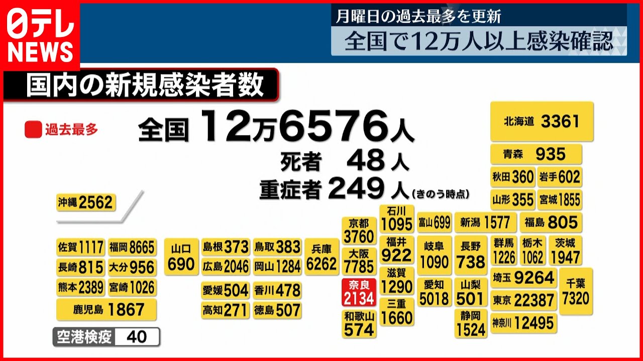 NNNの調べによりますと、午後7時時点の全国の感染者は12万6576人で感染者の報告が比較的少ない傾向にある月曜日として過去最多を更新しました。奈良県では2134人と過去最多を更新しています。