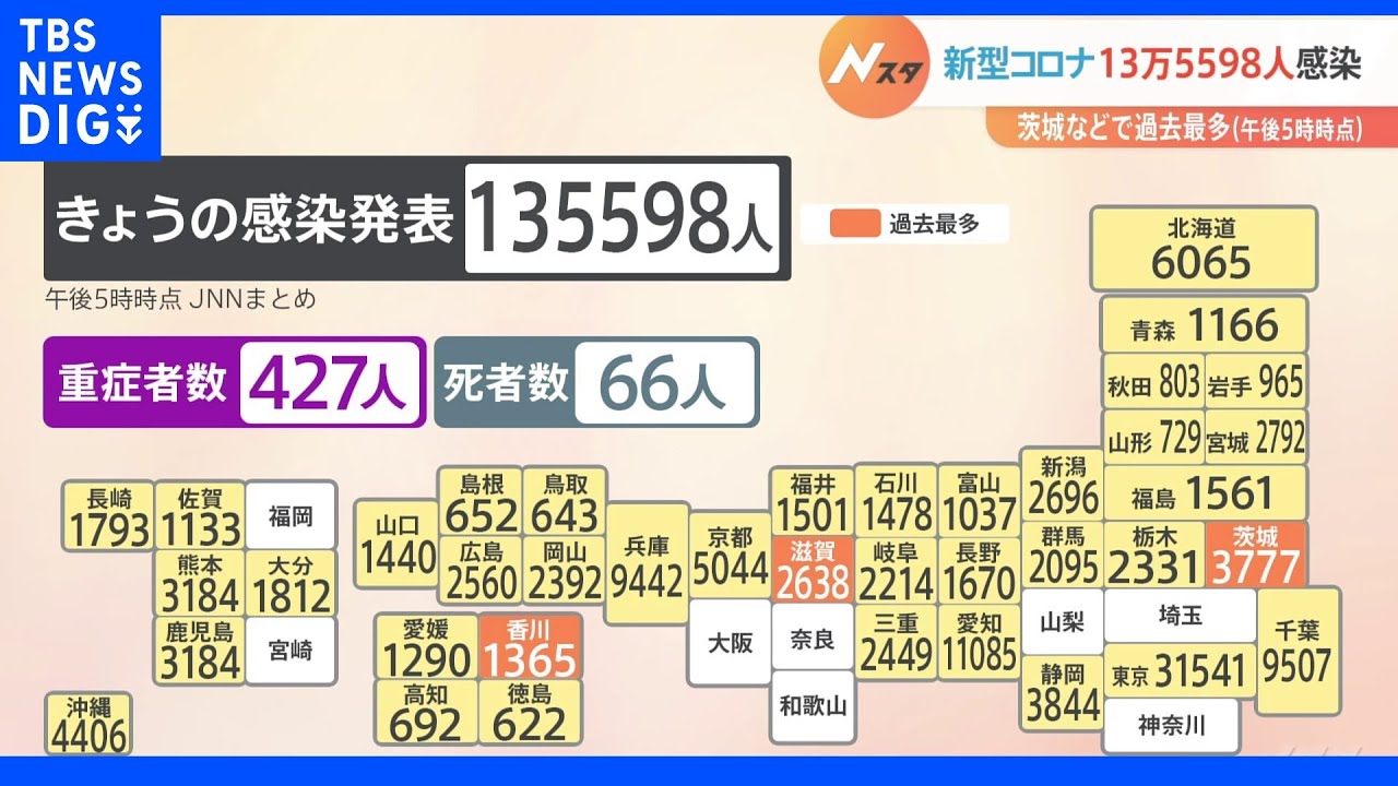 JNNのまとめによりますと、全国ではこれまでに13万5598人の感染が発表されており、茨城、滋賀、香川の3つの県で過去最多を更新しています。