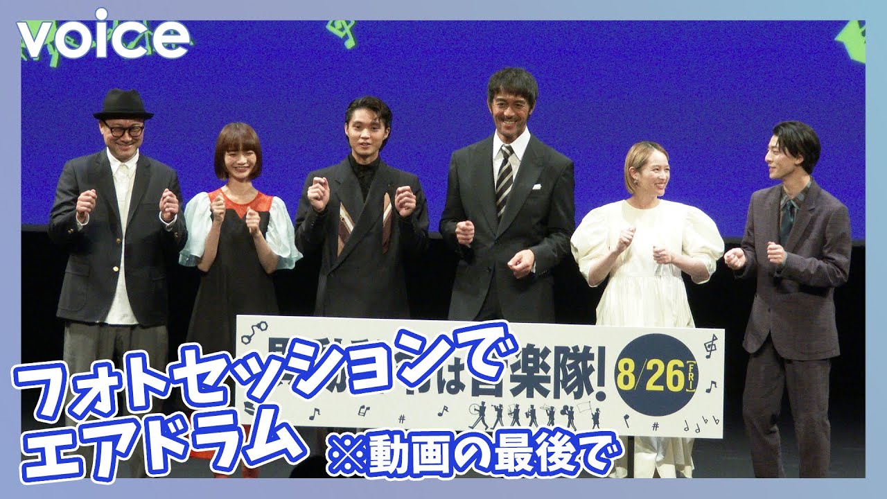 阿部寛、清野菜名、磯村勇斗、高杉真宙、見上愛、内田英治監督が28日、都内で行われた映画『異動辞令は音楽隊!』(8月26日公開)の完成披露試写会に登壇。警察音楽隊を題材にしているとあって、フォトセッションでは阿部が劇中で担当したドラム演奏にならいエアドラムを登壇者全員で“セッション”した。