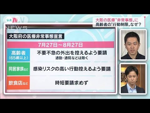大阪府は木曜日、65歳以上の高齢者に対して、不要不急の外出を控えるよう要請しました。期間は来月27日までの1か月です。この要請ですが、通勤や医療機関への通院など、生活や健康維持に必要なものは除くとしています。また、高齢者と日常的に接する同居家族などに対しても、感染リスクの高い行動を控えるよう求めています。吉村さん、この行動制限の対象が府民全員ではなく、高齢者になった理由を改めて教えてください。
