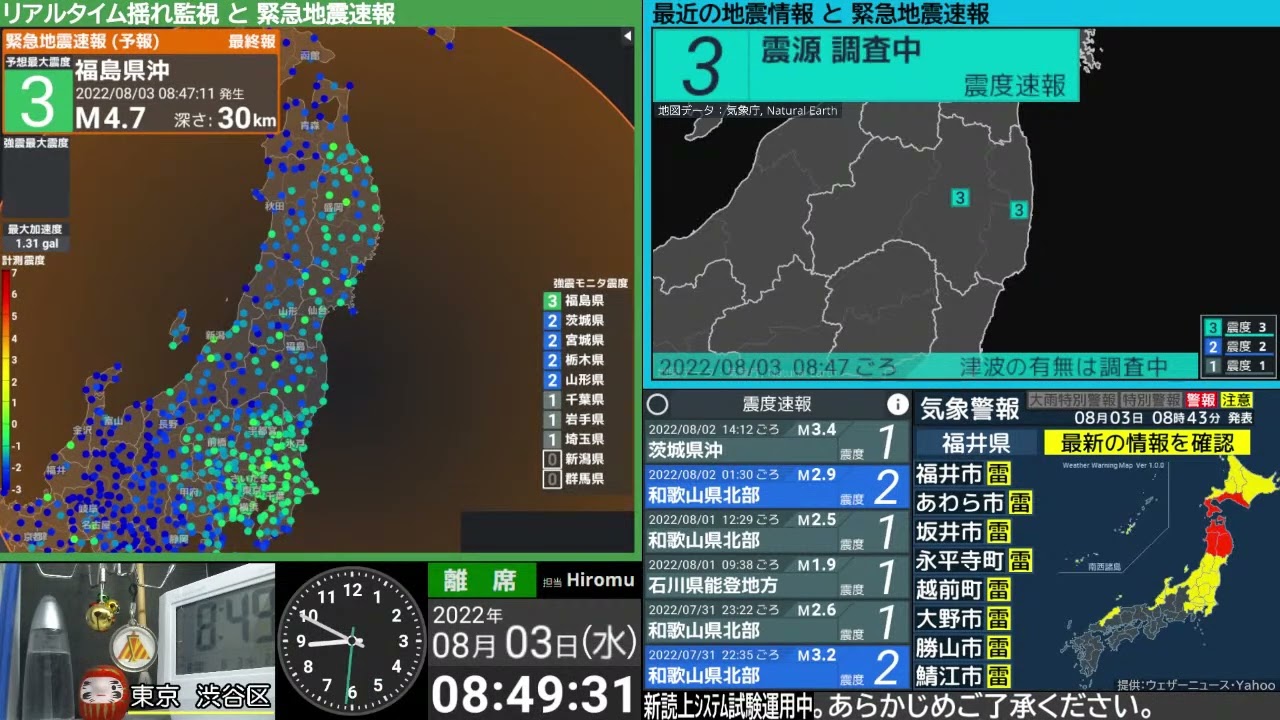 地震速報ライブ(短縮URL) https://bit.ly/3c7YQ1R 0:00 切り抜きアーカイブ 0:02 揺れ検知 0:06 緊急地震速報 (予報) 1:33 震度速報 3:00 震源情報 (津波の心配なし) 4:35 各地の震度情報 (詳細)福島県沖 震度3 M4.8 深さ30km 2022/8/3 8:47ごろ 23区5弱5強6弱6強EARTHQUAKEjdqJMAJQuakekiwiLiveNEWSPGATsunamiアーカイブいまごろツナミトカラニュースブレードマグニチュードみやすいモニタゆれライブライブ地震速報三陸二十三区今付近仙台北海道台風地方地震地震 ライブ地震ライブ地震ライブ配信中地震情報地震最新情報地震速報地震速報 ライブ大津波大津波警報宮城小笠原岩手巨大強震強震モニタ情報振動揺れ放送日本最大最近棒読み気象庁沖縄津波津波情報津波注意津波注意報津波警報海外海岸深さ深層深発災害琴葉発表監視福島緊急緊急地震速報緊急地震速報ライブ群発自作自然見やすい規模観測計測誘発読み上げ近海通り速報連発進路遠地配信開発雨震央震度震度3震度4震度7震源震源情報青森