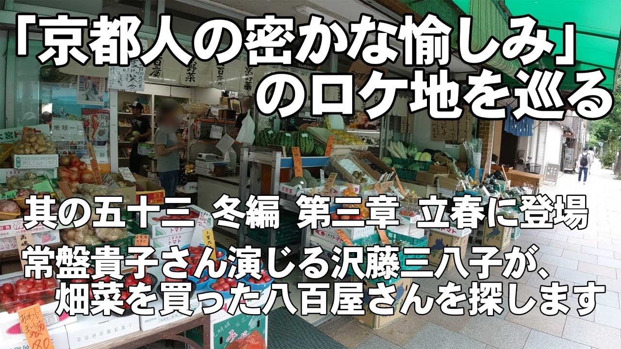 「京都人の密かな愉しみ」は、NHK BSプレミアムで2015年から数回に分けて放送されたドラマです。観光旅行では見えにくい京都人の生活や文化を、観光地ではない隠れた風景をロケ地に使ってコミカルに描いています。このロケ地をYouTubeで紹介します。今回は常盤貴子さん演じる沢藤三八子が、畑菜を買った八百屋さんを探します。 下御霊神社京都人の密かな愉しみ八百屋八百廣常盤貴子東京紅団畑菜