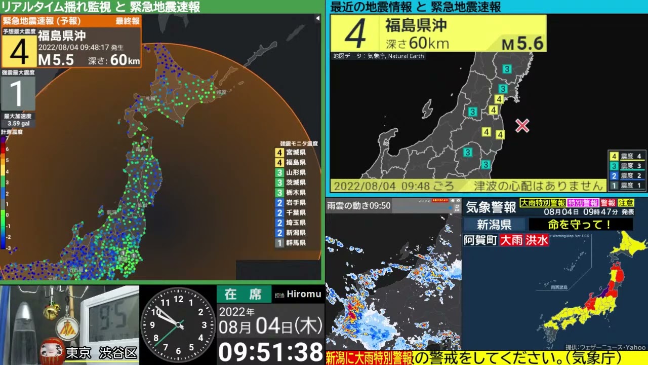 地震速報ライブ(短縮URL) https://bit.ly/3c7YQ1R 0:00 切り抜きアーカイブ 0:05 緊急地震速報 (予報) 1:33 震度速報 (第1報) 2:33 震度速報 (第2報) 2:56 震源情報 (津波の心配なし) 3:44 各地の震度情報 (詳細) 福島県沖 震度4 M5.6 深さ60km 2022/8/4 9:48ごろ 23区5弱5強6弱6強EARTHQUAKEjdqJMAJQuakekiwiLiveNEWSPGATsunamiアーカイブいまごろツナミトカラニュースブレードマグニチュードみやすいモニタゆれライブライブ地震速報三陸二十三区今付近仙台北海道台風地方地震地震 ライブ地震ライブ地震ライブ配信中地震情報地震最新情報地震速報地震速報 ライブ大津波大津波警報宮城小笠原岩手巨大強震強震モニタ情報振動揺れ放送日本最大最近棒読み気象庁沖縄津波津波情報津波注意津波注意報津波警報海外海岸深さ深層深発災害琴葉発表監視福島緊急緊急地震速報緊急地震速報ライブ群発自作自然見やすい規模観測計測誘発読み上げ近海通り速報連発進路遠地配信開発雨震央震度震度3震度4震度7震源震源情報青森