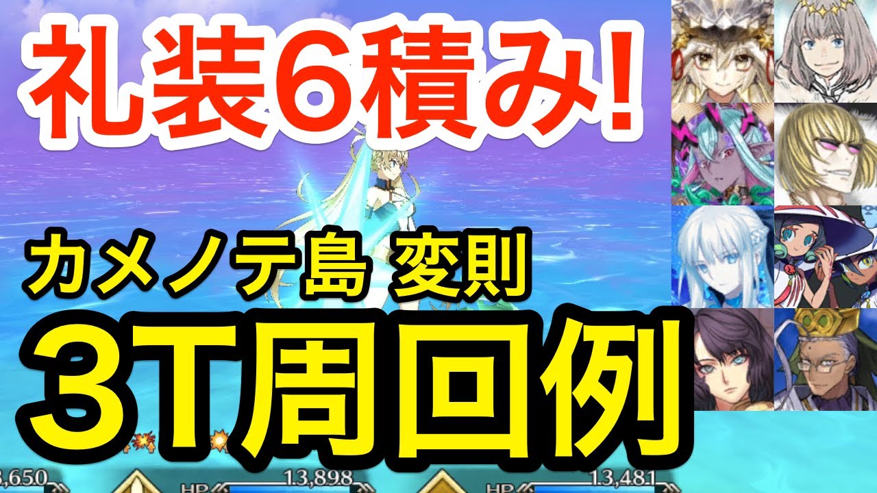 水怪クライシスイベのフリクエ、カメノテ島「大怪獣からの救出」礼装6積み3ターン周回例。編成を6パターン収録しています。