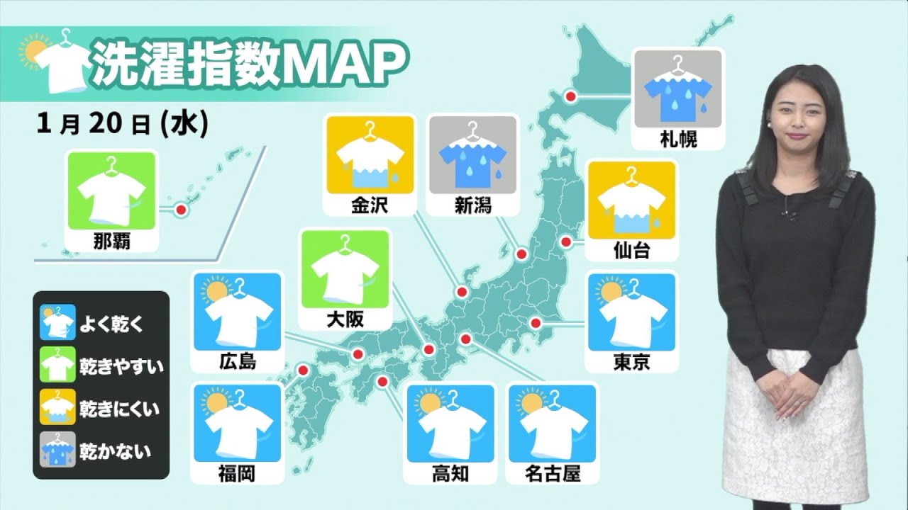 20日(水)は冬型の気圧配置が緩み、本州付近は高気圧に広く覆われて一日晴れます。西日本〜東日本の広範囲で洗濯の外干しが出来そうです。 2020Casterウェザーニュースキャスターゲリラ豪雨ゲリラ雷雨ニュース予報北日本台風台風情報地震大雨天気天気予報情報東日本気象気象予報士減災西日本防災