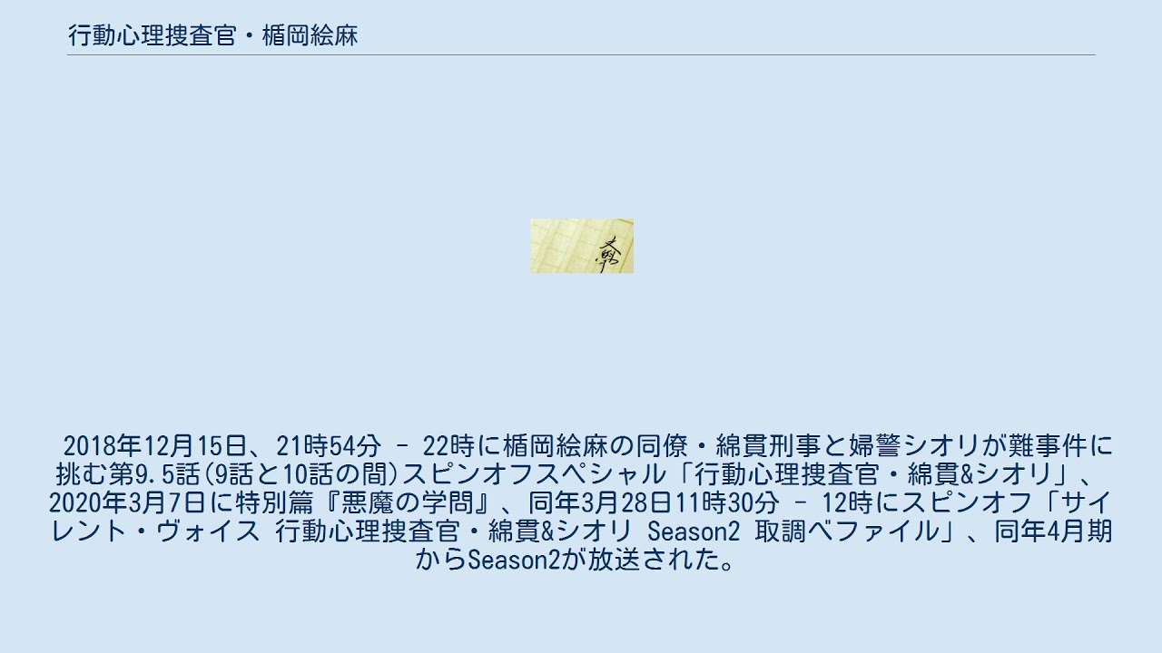 2018年12月15日、21時54分 – 22時に楯岡絵麻の同僚・綿貫刑事と婦警シオリが難事件に挑む第9.5話(9話と10話の間)スピンオフスペシャル「行動心理捜査官・綿貫&シオリ」、2020年3月7日に特別篇『悪魔の学問』、同年3月28日11時30分 – 12時にスピンオフ「サイレント・ヴォイス 行動心理捜査官・綿貫&シオリ Season2 取調べファイル」、同年4月期からSeason2が放送された。