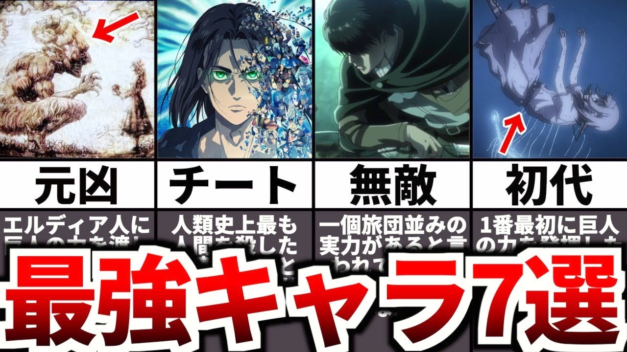 今回は進撃の巨人の最強キャラを7人紹介していきました! みなさんは、どのキャラが最も最強だと思いますか? コメント欄で教えてください! 参考資料&引用 ©諫山創・講談社/「進撃の巨人」The Final Season製作委員会 ※動画内で使用している全ての画像は上記の作品からの引用させていただいております。 #進撃の巨人 #ファイナルシーズン #The Final Season Part2 #考察 The Final Seasonエレンファイナルシーズンライナーリヴァイ巨人考察解説進撃の巨人進撃の巨人 The Final Season Part 2