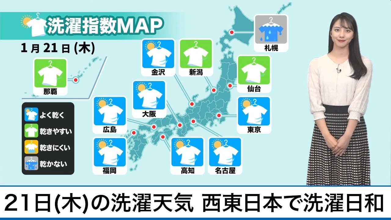 21日(木)は移動性高気圧が東に離れるものの、日本付近に勢力を残し、関東から西の各地は穏やかに晴れる所が多くなります。