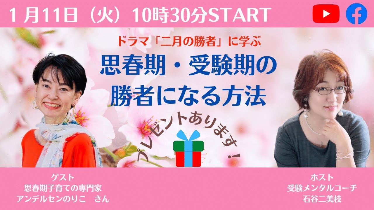 Share Facebook Twitter Pinterest LinkedIn #373 ドラマ「二月の勝者」に学ぶ〜思春期・受験にの勝者になる方法 2022年1月11日(火)10時30分配信 ドラマ「二月の勝者」観てましたか? イライラしないママになる専門家石谷二美枝と 思春期子育ての専門家アンデルセンのりこさんが ガチで思春期受験期のママに物申す1本勝負!! これを観ないとお仕置きだぞ!(笑 のりこさんからのプレゼントがありますよ〜〜 二月の勝者