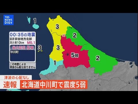各地の震度は、震度5強が、北海道・上川中川町、震度4が遠別町、猿払村、豊富町、幌延町となっています。