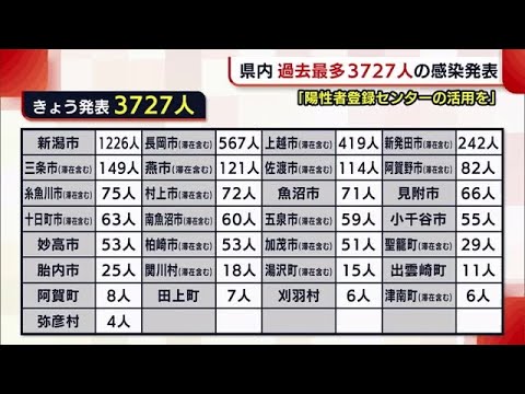 新潟県内で18日、新たに新型コロナウイルス感染が発表されたのは新潟市で1226人、長岡市で567人など合わせて3727人で、一日の新規感染者数は過去最多を更新しました。