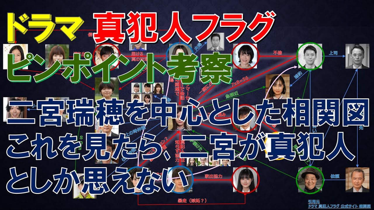 【真犯人フラグ】ドラマ ~ピンポイント考察~ 二宮瑞穂を中心とした相関図、これを見たら、二宮が真犯人としか思えない【西島秀俊、芳根京子、宮沢りえ、生駒里奈、桜井ユキ、佐野勇斗】と題して、日曜、22時30分から日本テレビ系列で放送されているドラマ、真犯人フラグの、これまでに起こった出来事や人の繋がりを、二宮を中心にピンポイント考察してみたいと思います。