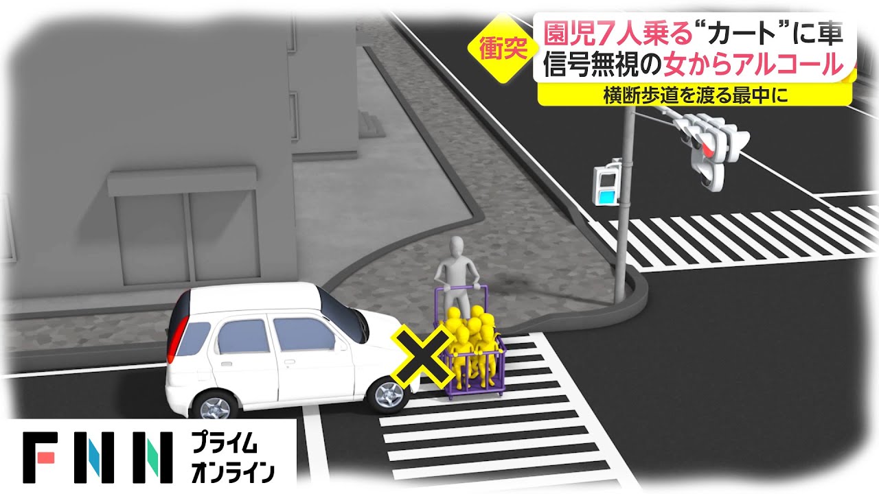 赤信号を無視して直進してきた軽乗用車は、横断歩道を渡っていた園児7人を乗せた手押し車に衝突した。