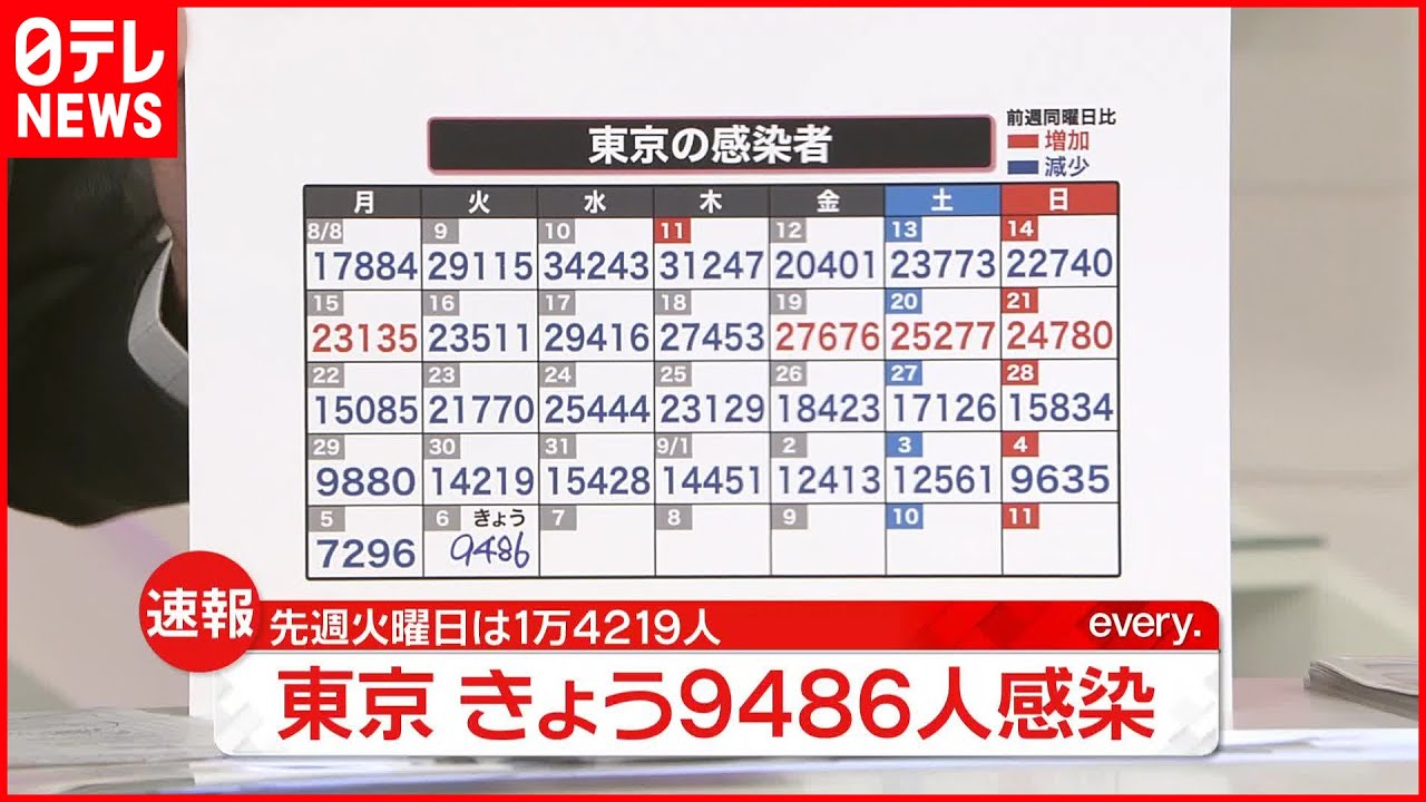 東京都で新たに9486人の新型コロナウイルスへの感染が確認されました。先週火曜日からは4733人減り、16日連続で前の週の同じ曜日の人数を下回りました。火曜日で1万人を下回るのは、7月5日以来2か月ぶりとなります。