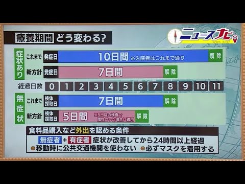 ウイルスが完全になくなるわけではなく感染リスクが残ることから、療養期間は短縮されるが、『症状のある人は10日間』『症状のない人は7日間』は高齢者など重症化リスクのある人との接触を避けることや、感染リスクの高い場所の利用や会食を避けることなどを求めている。