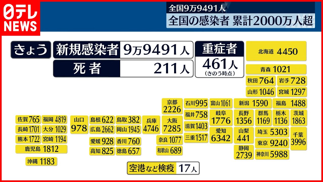 9日、全国で確認された新型コロナウイルスの感染者は9万9491人で、国内の感染者の累計が2000万人を超えました。