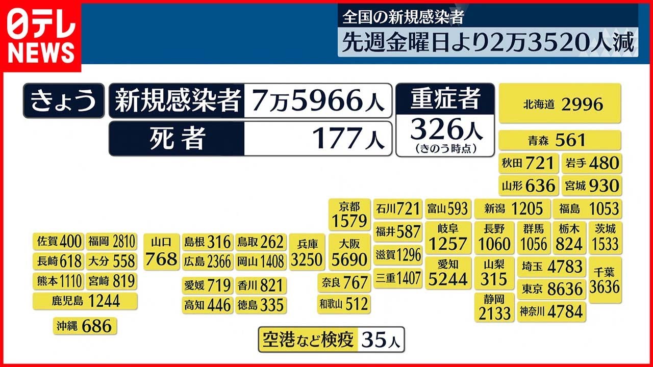 NNNのまとめによる全国の新たな感染者は7万5966人で、先週金曜日より2万3520人減っています。
