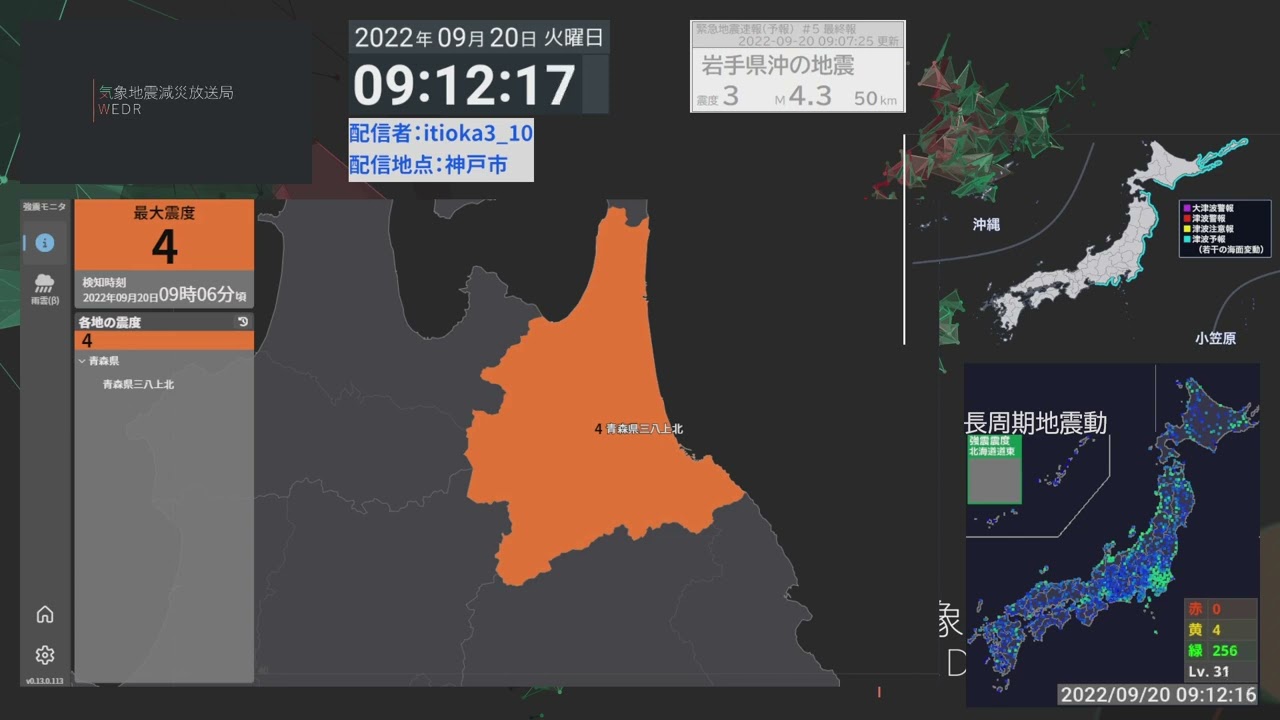 地震情報(震源・震度情報) 令和4年9月20日09時10分 気象庁発表20日09時06分ころ、地震がありました。 震源地は、岩手県沖(北緯40.1度、東経142.1度)で、震源の深さは約50km、地震の規模(マグニチュード)は4.4と推定されます。 この地震による津波の心配はありません。 alertEARTHQUAKEjapanLiveTsunamiライブ地震映像津波緊急速報震源情報