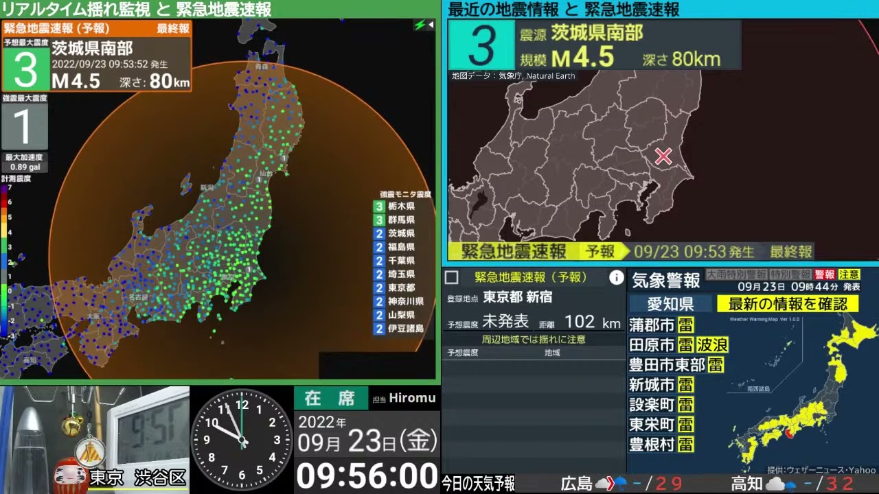 地震速報ライブ(短縮URL) https://bit.ly/3c7YQ1R 0:00 切り抜きアーカイブ 0:02 揺れ検知 0:04 緊急地震速報 (予報) 1:38 震度速報 2:13 震源情報 (津波の心配なし) 3:53 各地の震度情報 (詳細)茨城県南部 震度3 M4.6 深さ80km 2022/9/23 9:53ごろ 23区5弱5強6弱6強EARTHQUAKEjdqJMAJQuakekiwiLiveNEWSPGATsunamiアーカイブいまごろツナミトカラニュースブレードマグニチュードみやすいモニタゆれライブライブ地震速報三陸二十三区今付近仙台北海道台風地方地震地震 ライブ地震ライブ地震ライブ配信中地震情報地震最新情報地震速報地震速報 ライブ大津波大津波警報宮城小笠原岩手巨大強震強震モニタ情報振動揺れ放送日本最大最近棒読み気象庁沖縄津波津波情報津波注意津波注意報津波警報海外海岸深さ深層深発災害琴葉発表監視福島緊急緊急地震速報緊急地震速報ライブ群発自作自然見やすい規模観測計測誘発読み上げ近海通り速報連発進路遠地配信開発雨震央震度震度3震度4震度7震源震源情報青森