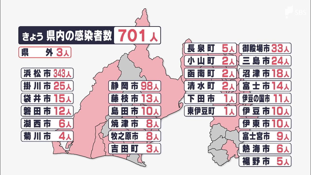 Share Facebook Twitter Pinterest LinkedIn 9月26日、静岡県内では新たに701人が新型コロナウイルスに感染したことが確認されました。 701人の感染者を自治体別にみますと、浜松市343人、静岡市98人、御殿場市33人などとなっています。死者の報告は、ありませんでした。 1日あたりの感染者数は先週の月曜日(9月19日605人)より96人多く、8日ぶりに前の週を上回りました。 病床使用率は、県全体で25.6%となっています。 #LIVEしずおか 9月26日放送 JNNLocalNEWSSBSSBSテレビTBS系列TVUCOLVB0iYK8ahQ0mFn-lF-8gニュースローカルローカルニュース新型ウイルス感染拡大で静岡静岡放送静岡新聞静岡新聞ニュース静岡県