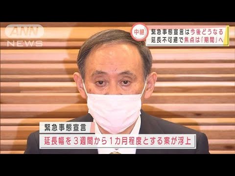 政府内からは今の状況が続けば延長は避けられないとの見方が強まっていて、今後の焦点は延長の期間とその対象地域となります。
