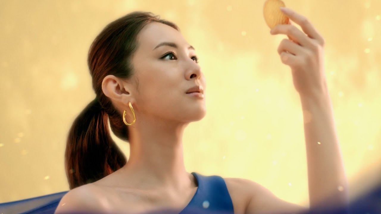 満月が煌々と輝く夜空に登場した月の女神が、優雅な世界観の中でムーンライトをうっとりと口に運ぶ。ムーンライトのサクッとほどける食感、卵と小麦と甘みの「黄金比率」を表現したCMとなっている。
