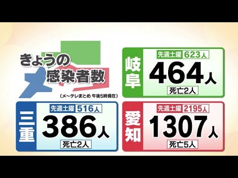 Share Facebook Twitter Pinterest LinkedIn 新型コロナの8日の感染者数は、愛知県で1307人、岐阜県で464人、三重県で386人の感染が確認されました。 愛知県では基礎疾患があった60代の男性など5人の死亡が確認されました。 岐阜県では2人、三重県では基礎疾患があった50代の男性など2人の死亡が確認されました。 コロナ感染者今日