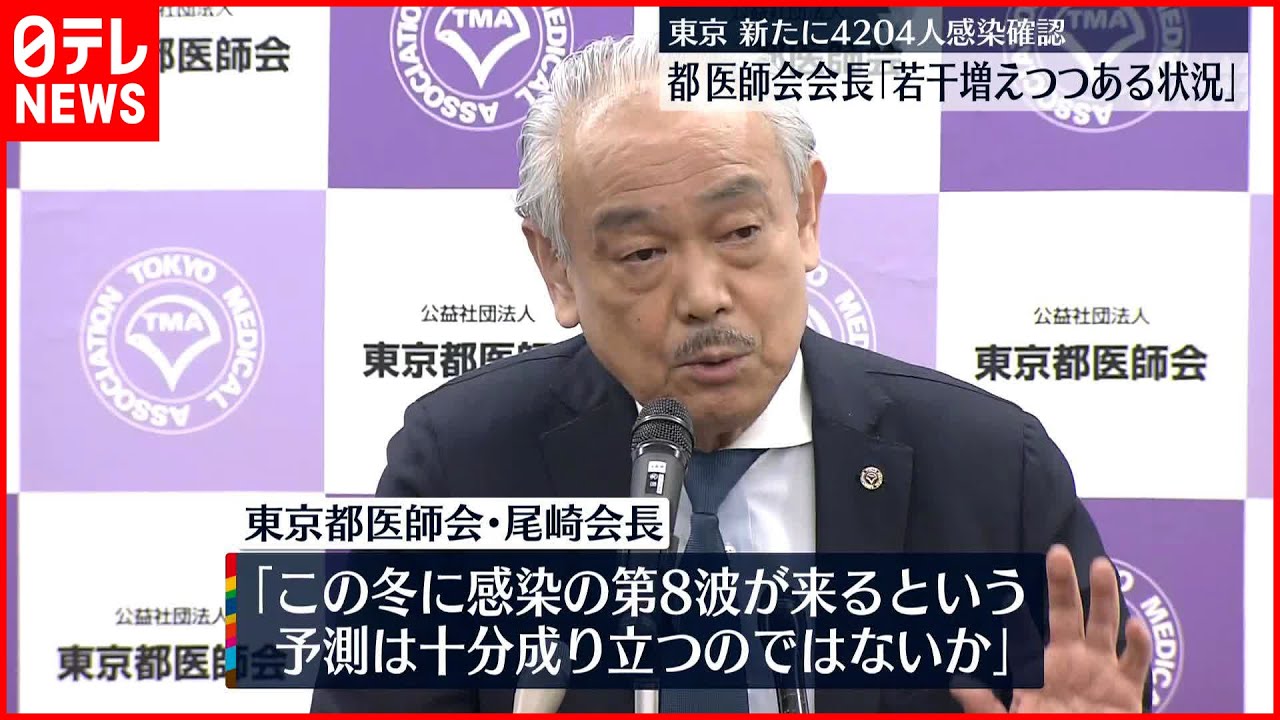東京都医師会の尾崎会長は会見で、ここ1週間の感染者数について「若干増えつつある状況」と述べ、その理由として、水際対策の緩和や気温低下による換気面の問題などをあげ、「この冬に感染の第8波が来るという予測は十分成り立つのではないか」と話しました。