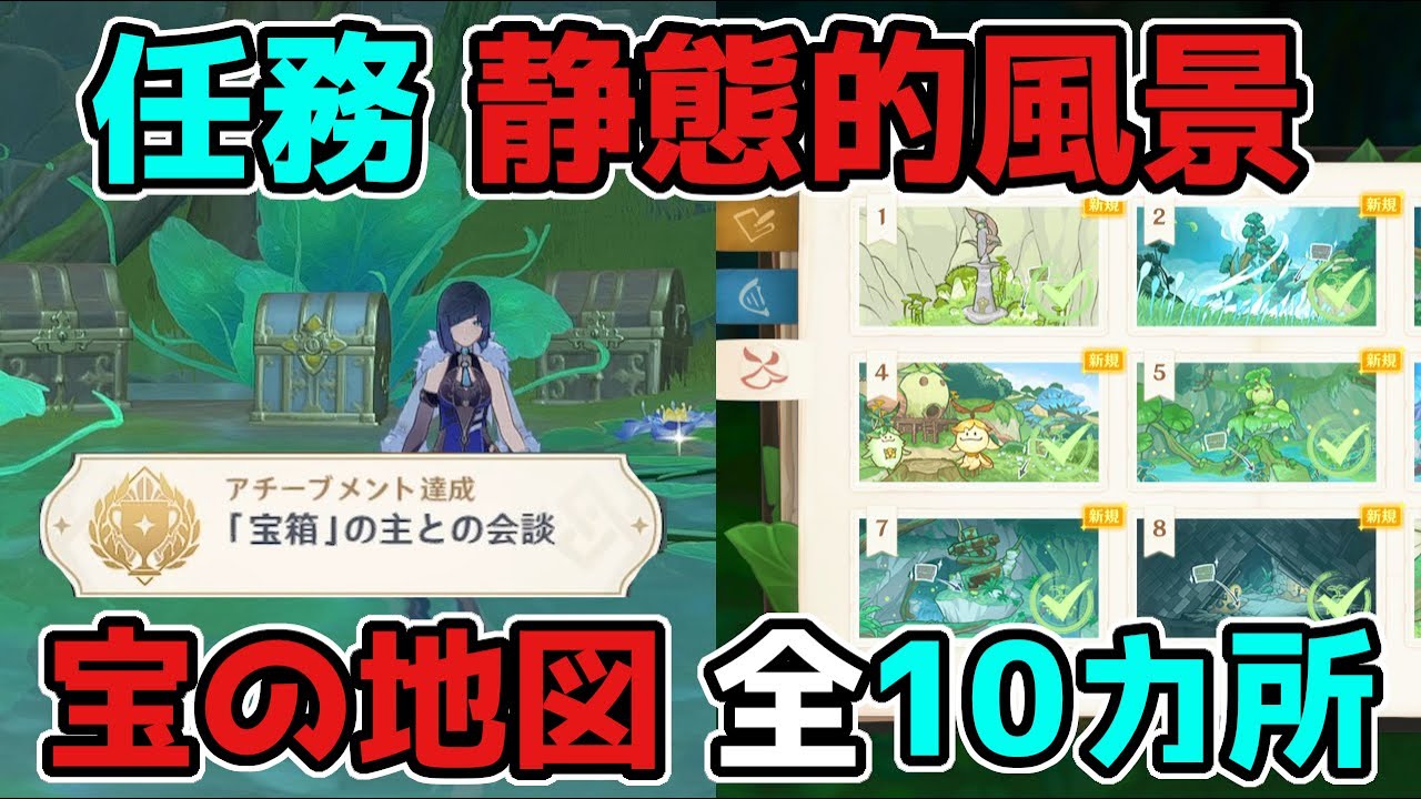 げんしん原神最新バージョンVer3.0のスメールにて「静態的風景」世界任務「宝の地図」全10カ所!不思議なクリップボードギミック謎解き攻略!についてご紹介した動画になります。解決法を見つける,なぞなぞ。旅人の皆さんにガチャでティナリ,コレイ,ドリー,鍾離(しょうり)甘雨(かんう)宵宮(ヨイミヤ)万葉(カズハ)クレー夜蘭(イェラン)神里綾華(かみさとあやか)神里綾人ウェンティ雷電将軍と珊瑚宮心海(サンゴノミヤココミ)八重神子(やえみこ)申鶴(しんかく)魈(しょう)荒瀧一斗(あらたきいっと),アルベド,エウルア,胡桃(フータオ)とタルタリヤが出ますように。他の動画などでは原石モラ育成素材豪華な宝箱天賦突破素材貴重な宝箱冒険経験値聖遺物稲妻評判経験値などの入手方法などもご紹介しています。このチャンネルではリーク画像や情報を扱っていません。考察情報なども公式情報を元に楽しむ内容となっています。