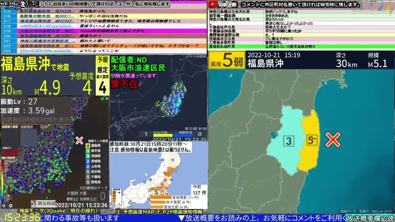コメ無し版【緊急地震速報】福島県沖(最大震度5弱 M5.0) 2022.10.22【BSC24】