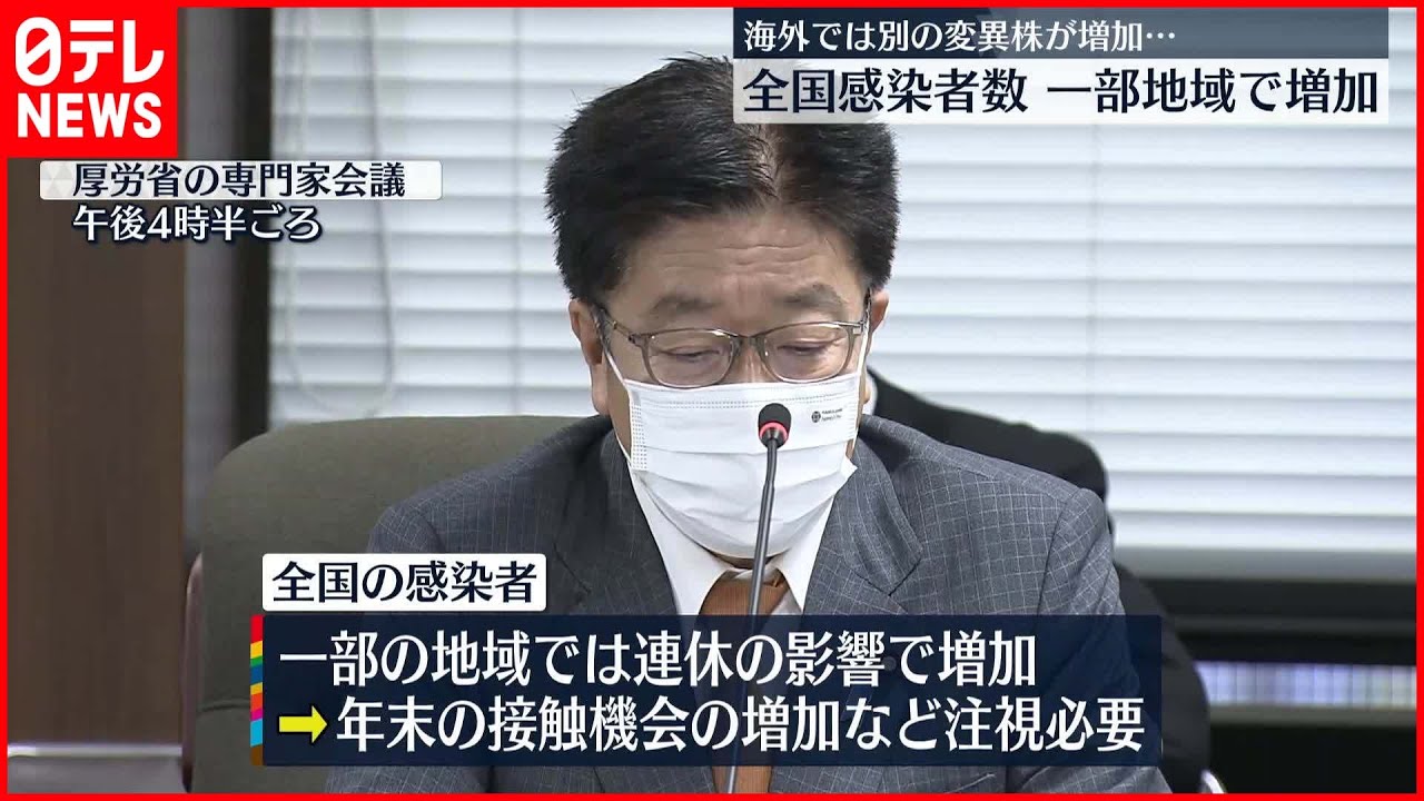 専門家会議は、全国の感染者の今週先週比は0.96となり、全国的には横ばいとなったものの、北海道や東北など一部の地域では、連休の影響で増加がみられるとして、今後も年末の接触機会の増加などを注視する必要があるとしています。