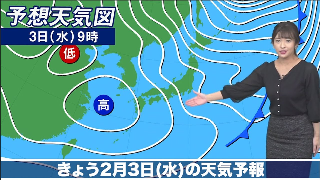3日(水)は二十四節気「立春」です。暦の上では春でも、天気は冬そのもの。日本付近は冬型の気圧配置で、上空には強い寒気が流れ込みます。日本海側は雪の降る所が多く、関東など太平洋側は冬晴れとなる見込みです。▼最新天気をLiVE解説(2/3の放送) 2021Casterウェザーニュースキャスターゲリラ豪雨ゲリラ雷雨ニュース乾燥予報停電北日本台風台風情報地震大雨大雪天気天気予報天気痛情報暴風東日本気象気象予報士洗濯減災西日本防災