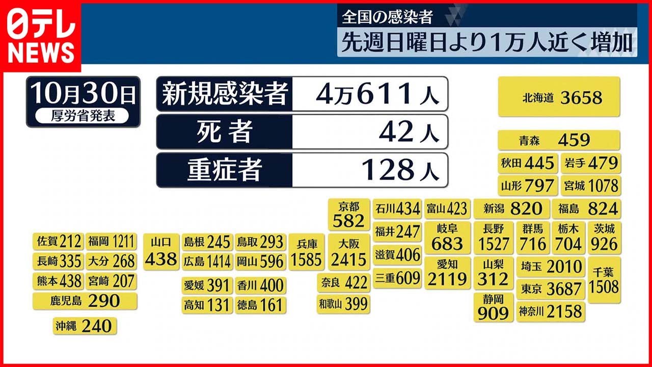 一方、全国の新たな感染者は、4万611人で先週日曜日(23日)と比べて9739人増えています。また、亡くなった方の報告は42人で、重症者は29日より1人減って128人でした。
