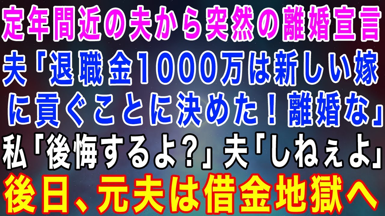 【スカッとする話】定年間近の夫から突然の離婚宣言。夫「退職金は新しい嫁に貢ぐわw」私「いいけど後悔するよ?」夫「しねぇよ!」→後日、元夫はなぜか多額の借金を背負うことになり…【修羅場】