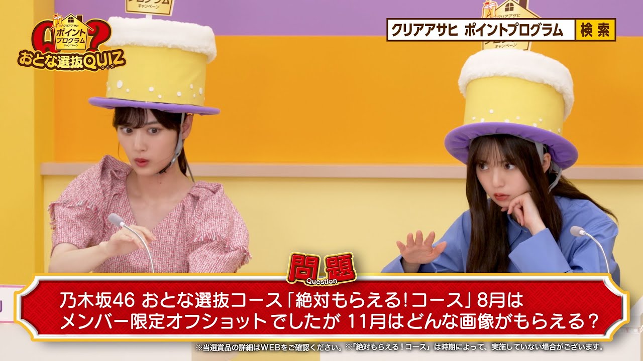 乃木坂46 おとな選抜がクリアアサヒポイントプログラムのクイズに挑戦! 期間限定「乃木坂46 おとな選抜コース」出現中! みんなで貯めて、楽しく応募♪ ▼クリアアサヒ ポイントプログラム 特設サイトはこちら▼ https://www.clearasahi-cp.jp/top.go アサヒアサヒビールおとな選抜ポイントプログラム与田祐希乃木坂46久保史緒里山下美月梅澤美波秋元真夏賀喜遥香遠藤さくら鈴木絢音齋藤飛鳥