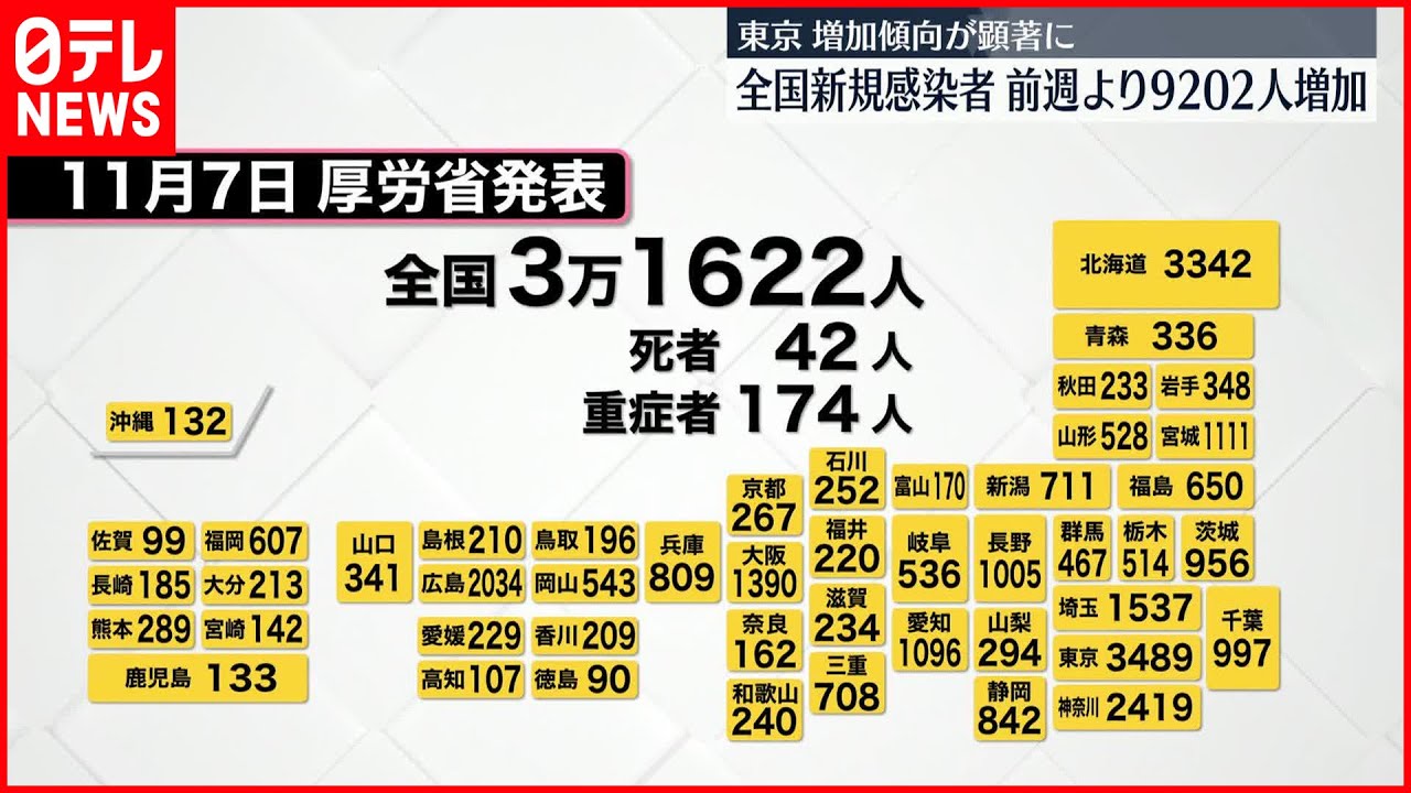 厚生労働省によりますと、全国の新たな感染者は3万1622人で、先週月曜日(11月31日)より9202人増えました。亡くなった方の報告は42人、重症者は前の日より4人増え174人でした。