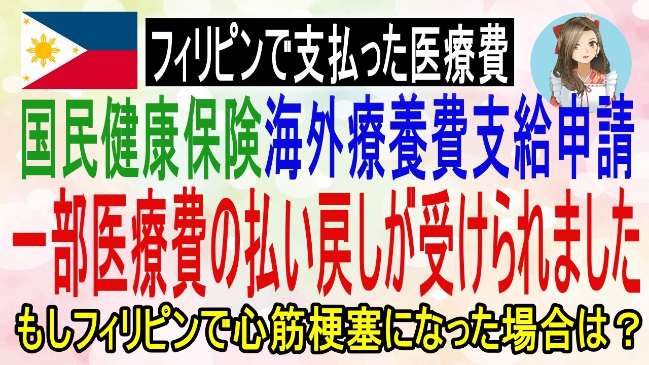 フィリピンで入院した際支払った医療費について、日本帰国時に 国民健康保険海外療養費支給申請しました、その数か月後一部医療費の払い戻しを受けることが出来きましたので、その内容について動画としてまとめてみました。さらに高額な医療費のケースとして、もしフィリピンで心筋梗塞になり手術を受けた場合の海外療養費支給申請の払い戻しについて、シミュレーションしてみました。