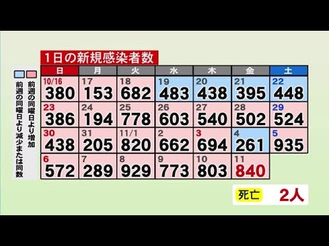 続いては新型コロナウイルスです。熊本県内ではきょう新たに840人の感染が確認されました。 1日の新規感染者数は先週の金曜日より579人増えていて7日連続で前の週を上回っています。 また、70代と90代以上のあわせて2人の死亡が発表されました。 840人コロナコロナウイルス感染感染確認新型
